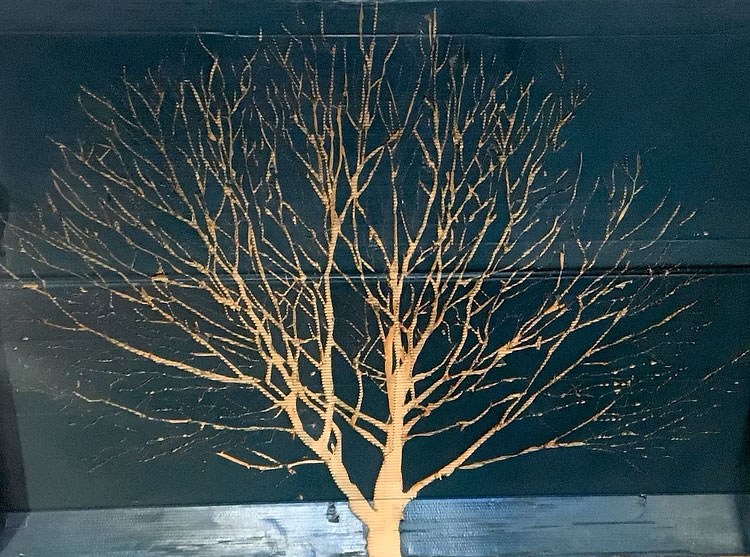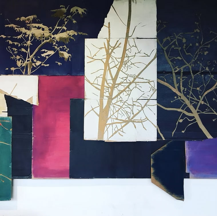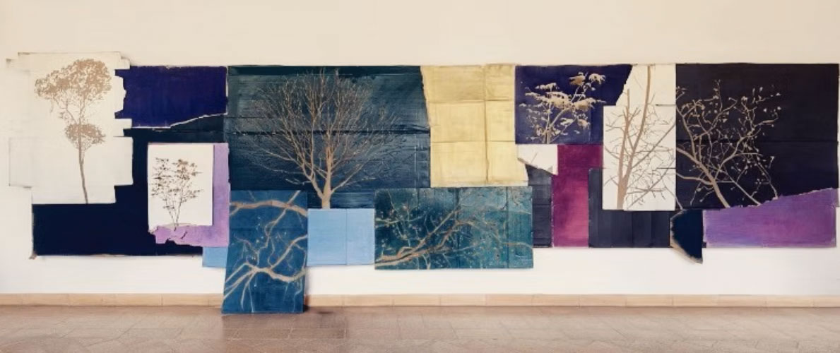 Le opere presenti in mostra sono di Guendalina Salini, artista romana famosa per la sua capacità di interpretare i luoghi cercando sempre di recuperarne l’essenza originaria. In questo caso Salini propone una serie di lavori in cornice e in istallazione in cui cartoni di riuso ospitano porzioni di alberi variopinti, nobilitando la materia usata e introducendo l’ospite in un vero bosco incantato.