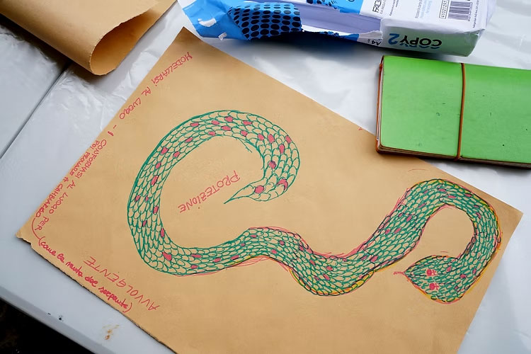 Attraverso questo lavoro abbiamo desiderato ascoltare un’altra Corviale, evocando il potere rigenerativo della Dea perché il serpente facesse la muta, abbiamo desiderato raccontare un’altra storia, non quella stereotipata di violenza e abbandono, ma un altro mito fondativo, un mito-eco-poietico per ricollegarci anche alle diverse forme di vita e di resistenza che crescono tutt’intorno all’edificio, al selvatico, all’incolto, a piante e ad animali che popolano questi luoghi e che possono comporre un nuovo vocabolario Marginale/Incivile/Fragile/Resistente/In-festante/Selvatico/Migrante…