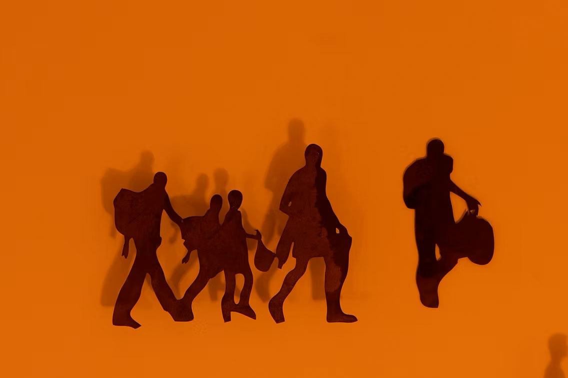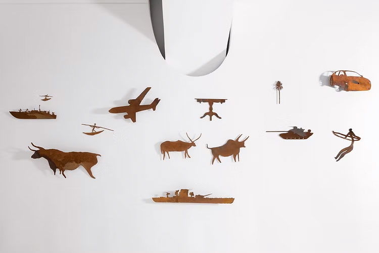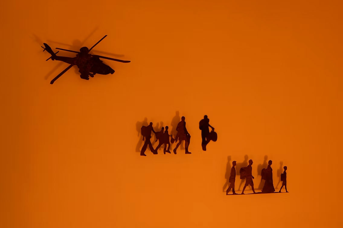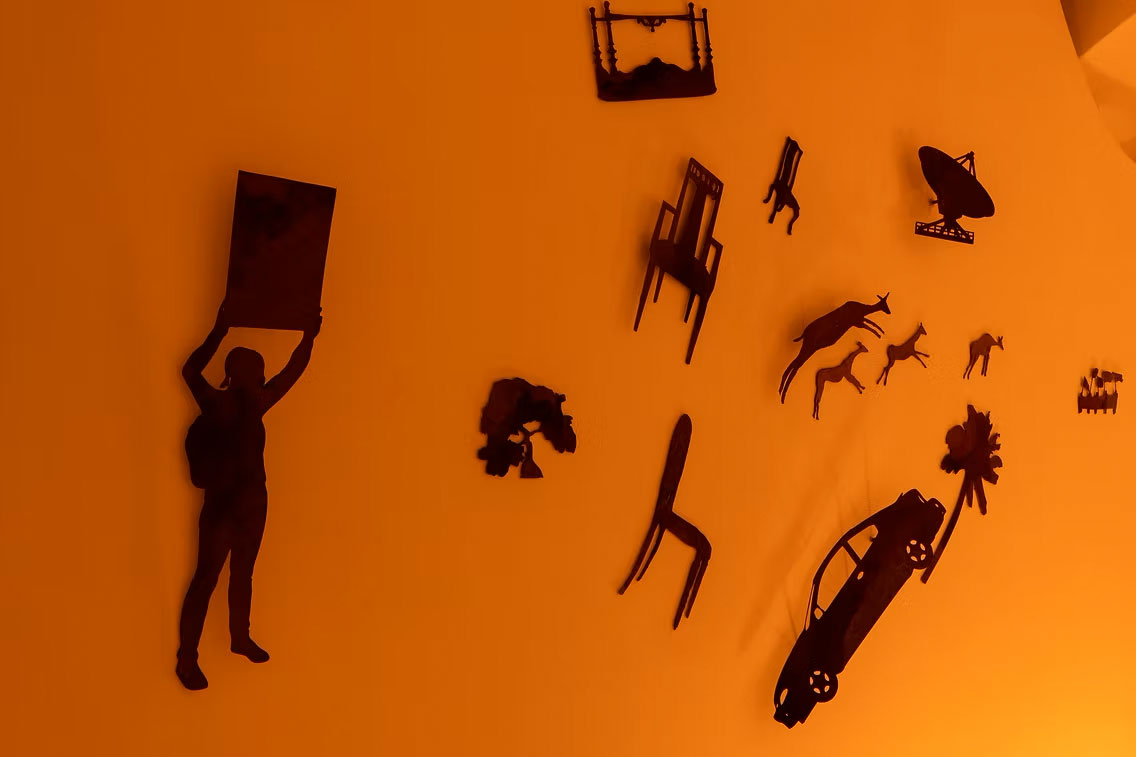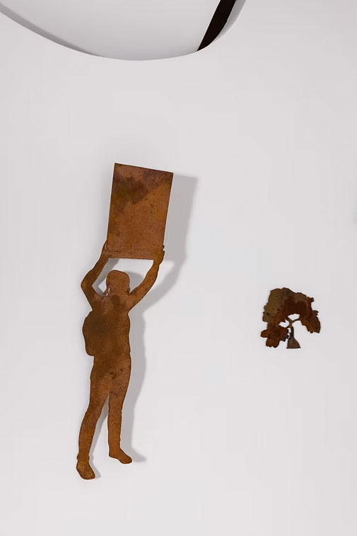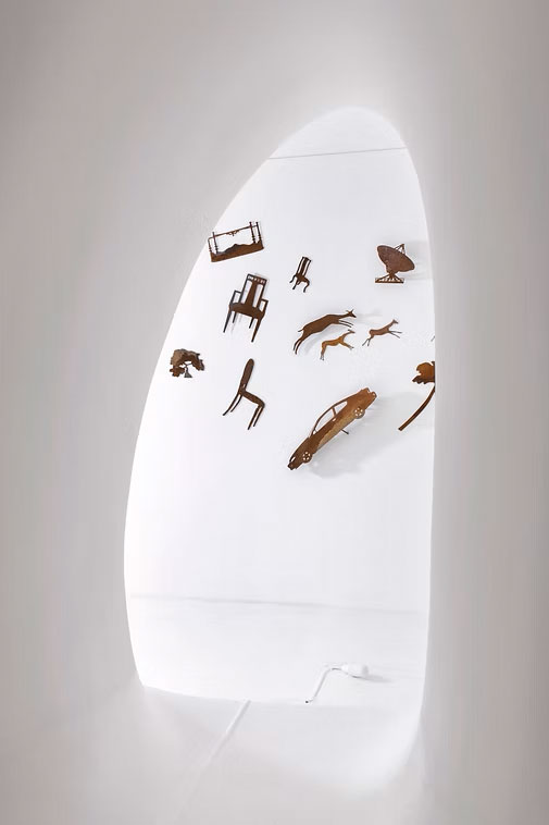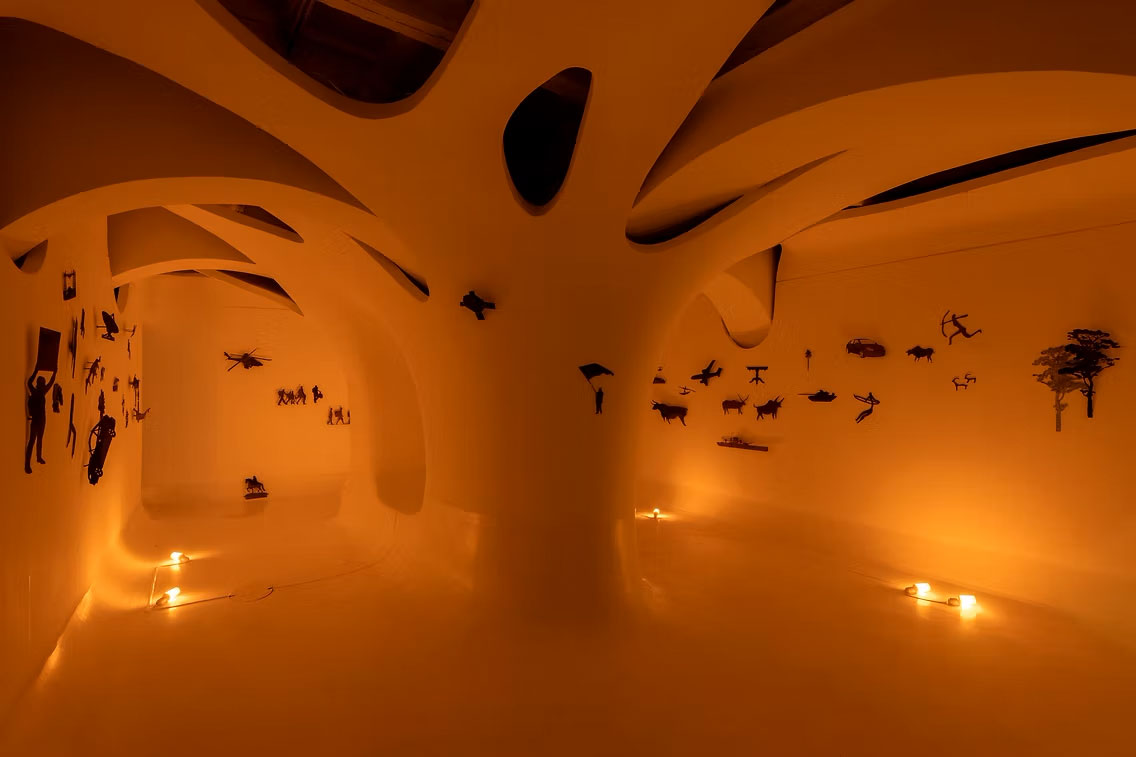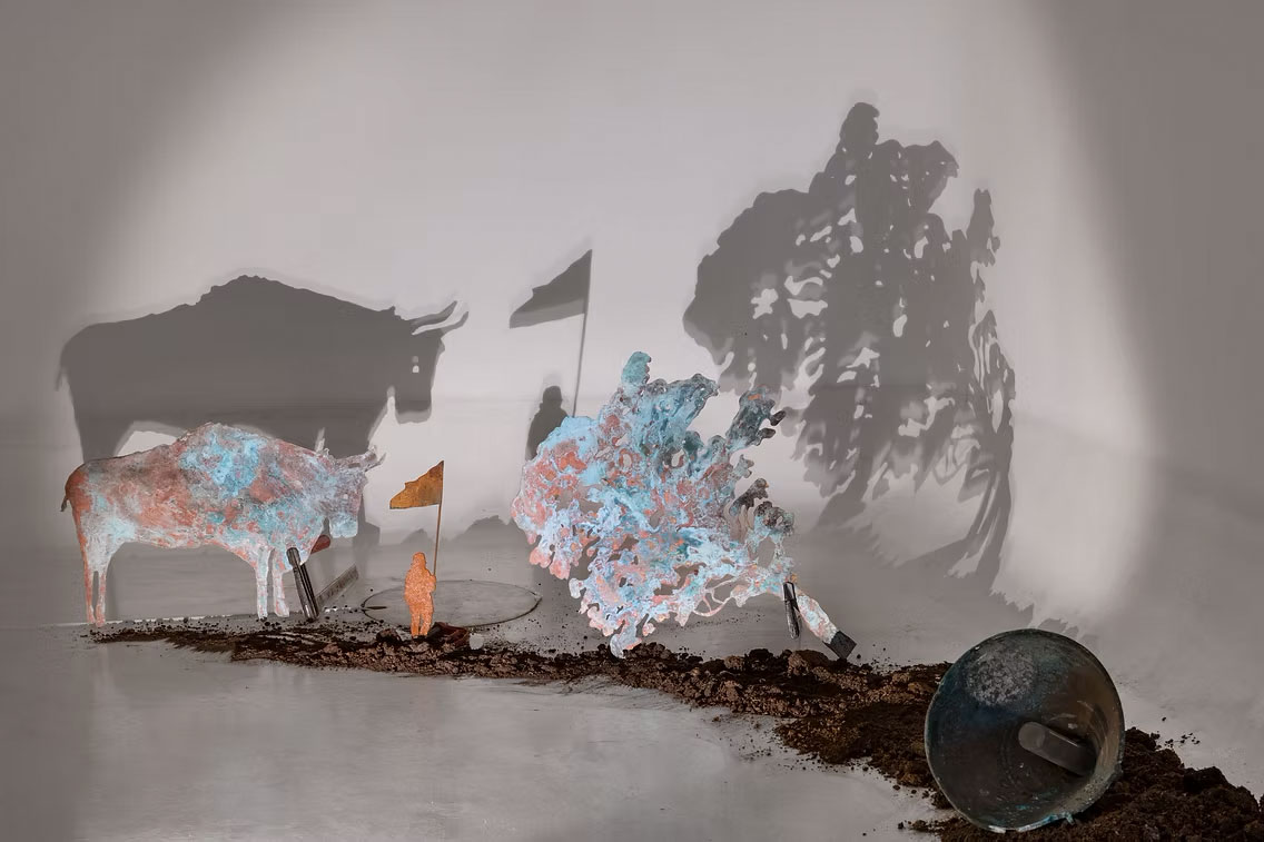 L’installazione ricorda un diorama, il pre-cinema, ed è una sorta di danza macabra sull’ impermanenza , il nostro essere di passaggio, ma contiene la possibilità ri-generativa e vitale di quello spirito che freme di cui parla Bataille in riferimento a Lascaux e che Anna Tzing ci insegna a cercare con nuove storie di vita tra le rovine, con pratiche creative e alleanze. Un’opera totale, dunque, che ci riporta dentro, un’esperienza interiore e nascosta che evoca la potenza dell’arcaico come antidoto alla modernità, un’esperienza fuori dal tempo, o meglio dentro al tempo, perché dentro un tempo mitico e magico, dove un bisonte può attaccare un elicottero e guerrieri antichi sono accanto a nuove lotte, migranti di oggi hanno come riferimento animali guida e totemici che si affiancano a popoli nomadi.