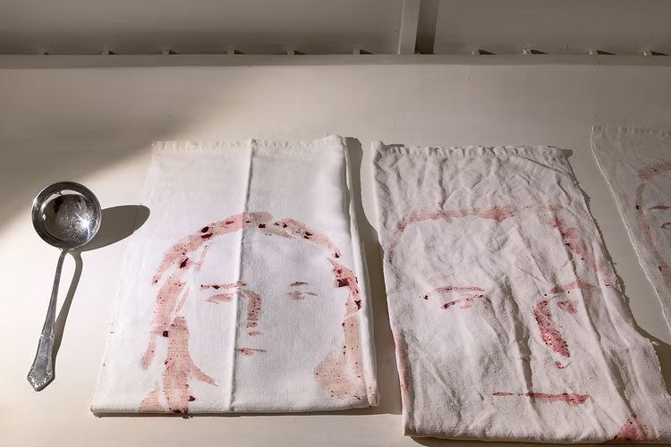 Gli utensili della cucina, di cui si sente il rumore, furono un’invenzione anteriore alle armi e questo lavoro invita a un convivio intorno al rito del cucinare, che crea nutrimento e calore . Alcuni ritratti di ragazzi conosciuti dall’artista durante una residenza artistica a Lviv in Ucraina sono disegnati con la barbabietola rossa- elemento del borch- su dei canovacci.