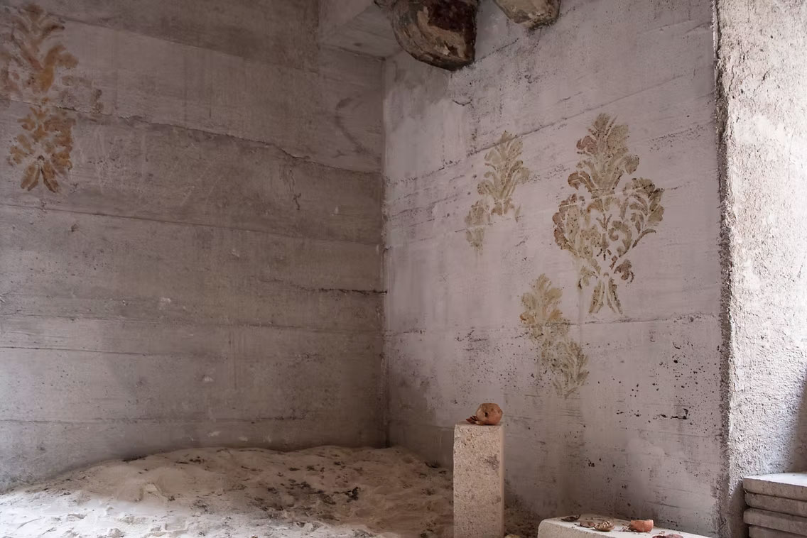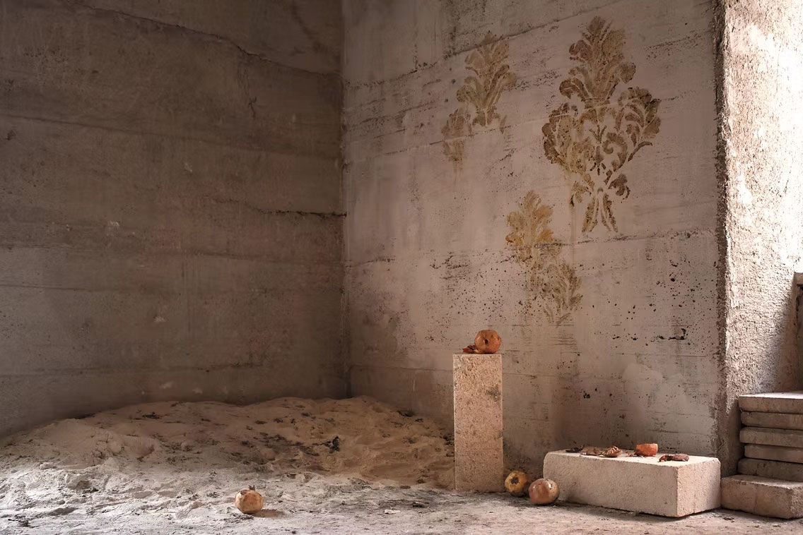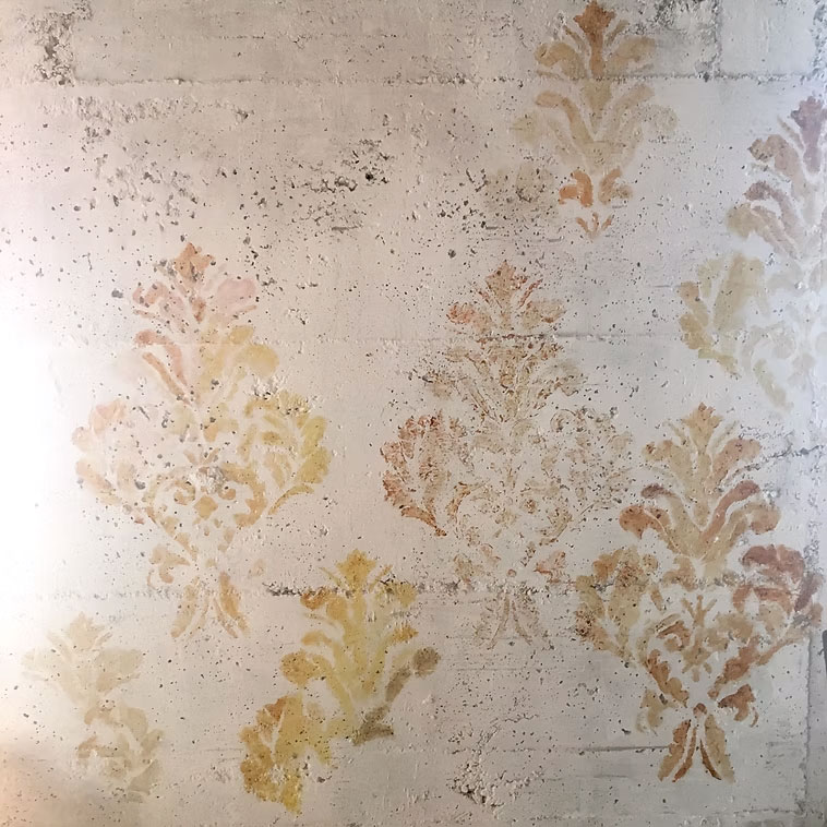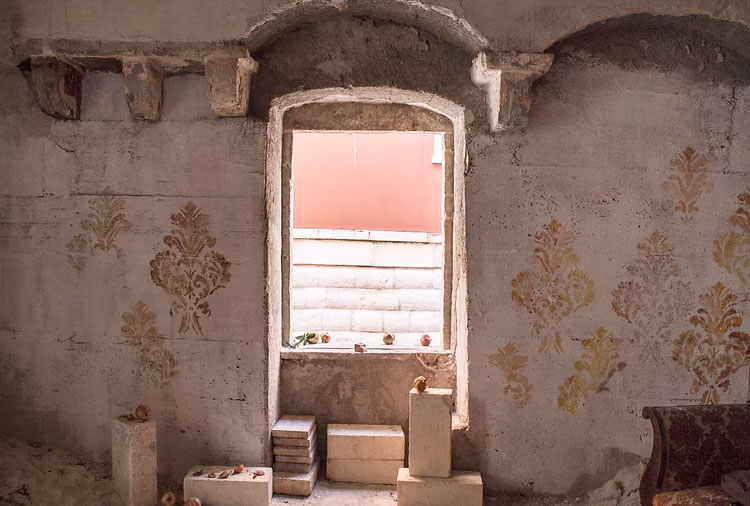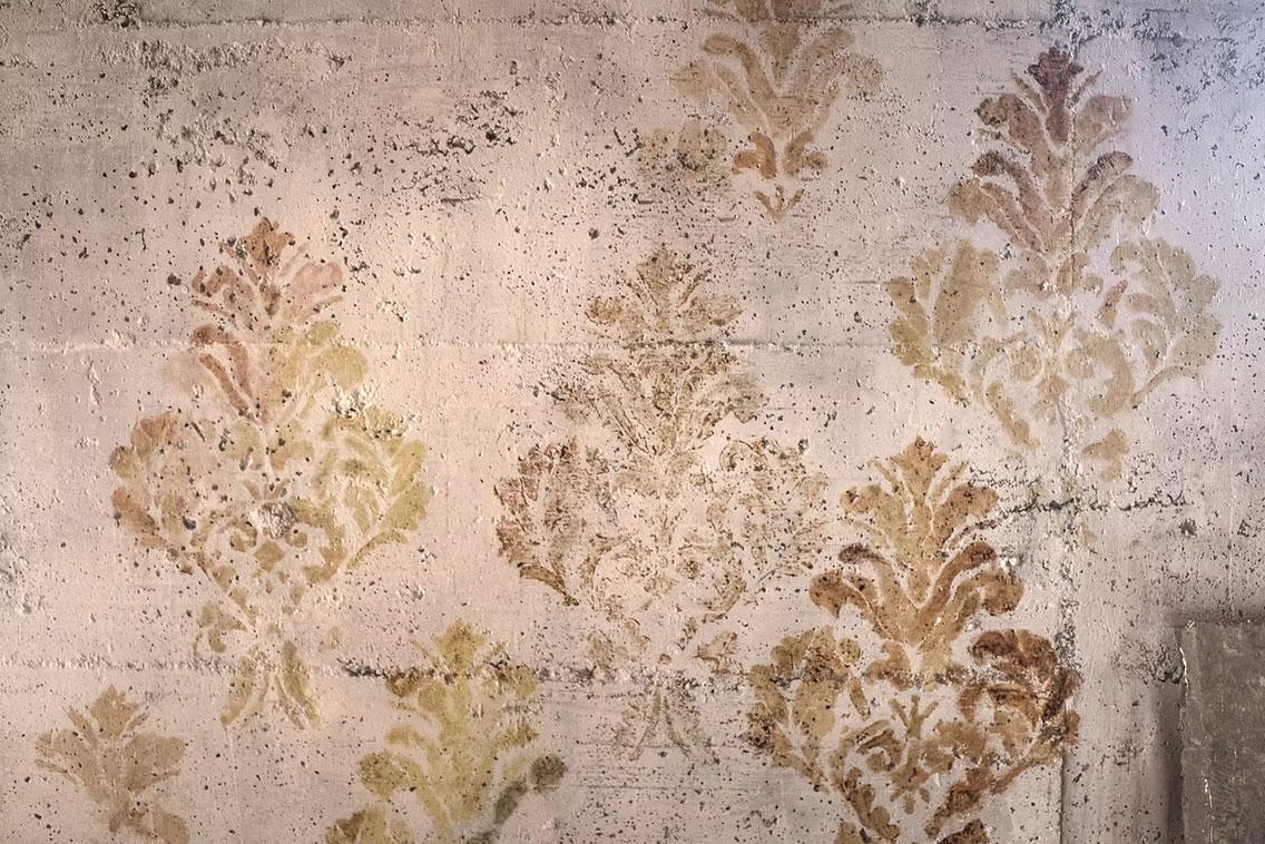 Installazione Site specific che si compone di disegni decorativi con motivi della tradizione di Damasco realizzati direttamente sulle pareti non intonacate di una casa abbandonata colma di detriti, sabbia, mattoni.