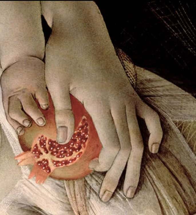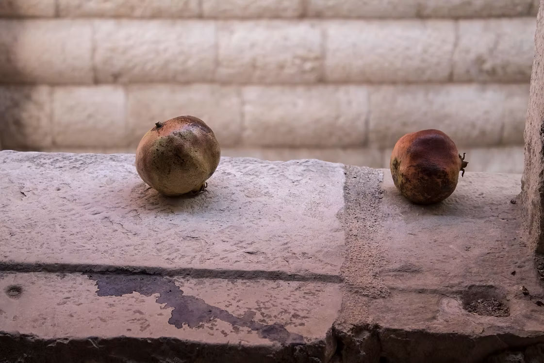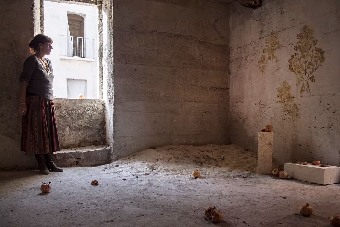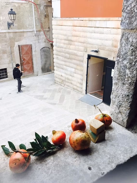 I disegni compongono l’installazione insieme a un frammento di un’immagine votiva che rappresenta una madonna con bambino la cui mano stringe un melograno e una poesia del poeta siriano Adonis.