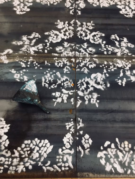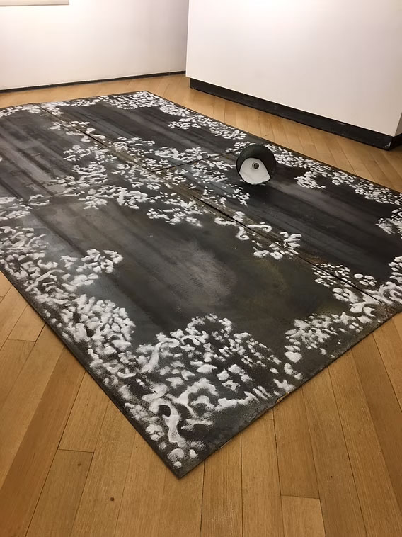 Per il tempo della mostra l’ossidazione degli elementi produce un disegno di ruggine e trasforma in un processo alchemico l’estetica e il significato dell’opera. Una trasmutazione che vuole essere un rito che accompagna Paolo, l’amico poeta e musicologo a cui è dedicata l’opera, in viaggo in una dimensione altra.