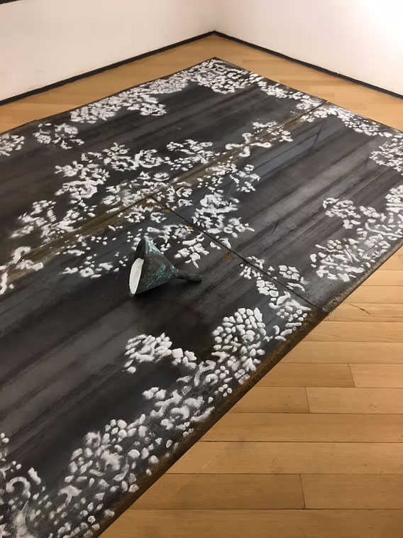 Tappeto di ferro e sale, imbuto di rame, elemento in vetro